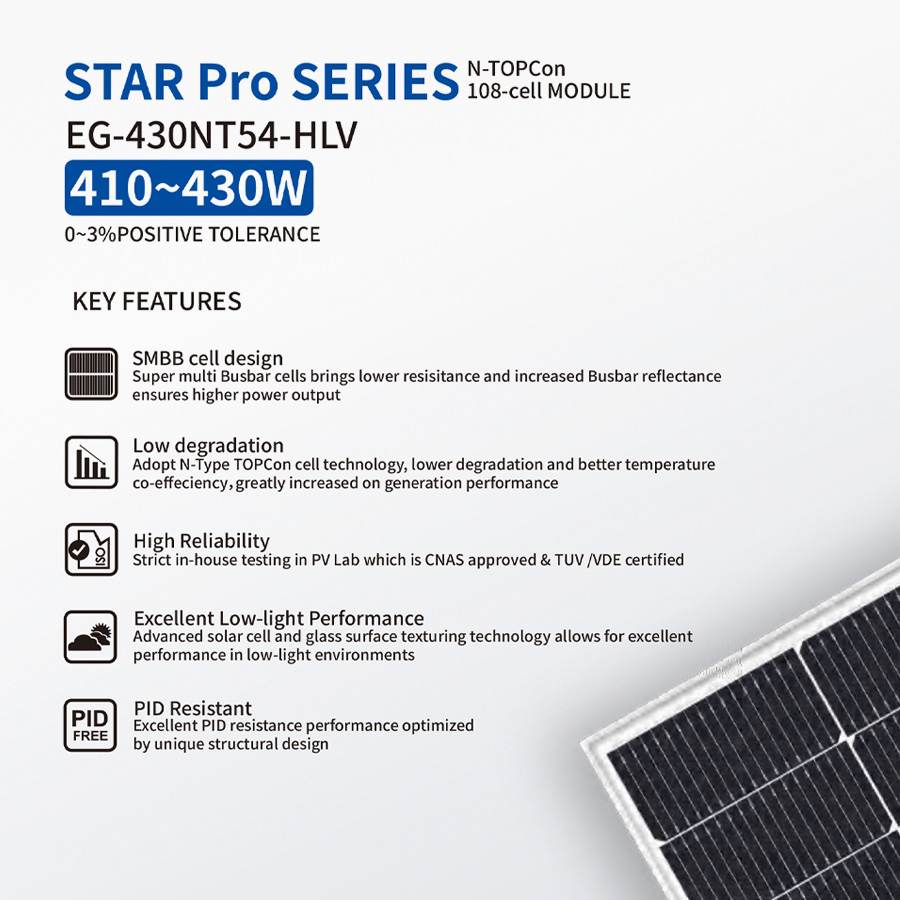 Questa tipologia di moduli garantiscono una bassa degradazione e un’alta affidabilità in quanto sono caratterizzati dalla tecnologia della cella Topcon di tipo N, avente un migliore coefficiente di temperatura che aumenta la prestazione del modulo stesso.